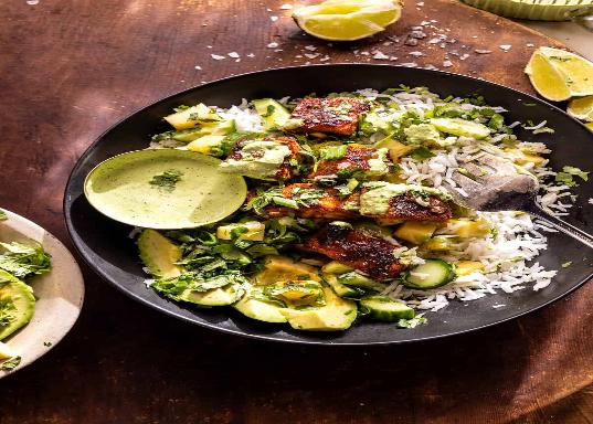 Chipotle Teriyaki Salmon Bowls with Creamy Green Sauce.